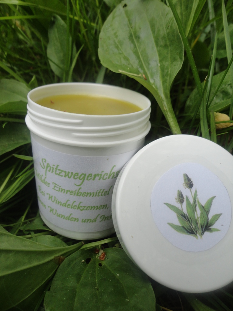 Also probierte ich die Spitzwegerich Salbe aus. Nachdem ich geduldig ca. 5 Wochen lang wartete, dass der Spitzwegerich seinen wertvollen Inhalt ans Öl abgibt konnte ich die Salbe gestern endlich fertigstellen.